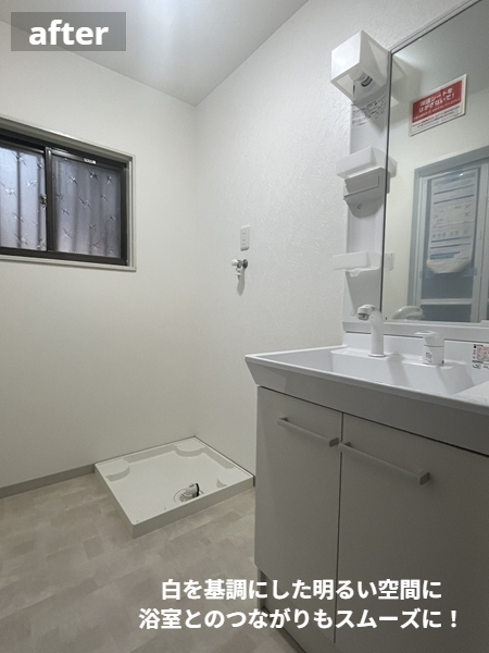 洗面化粧台と洗濯機パンを横並びに配置し、動線もスッキリしました。